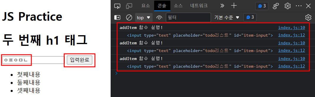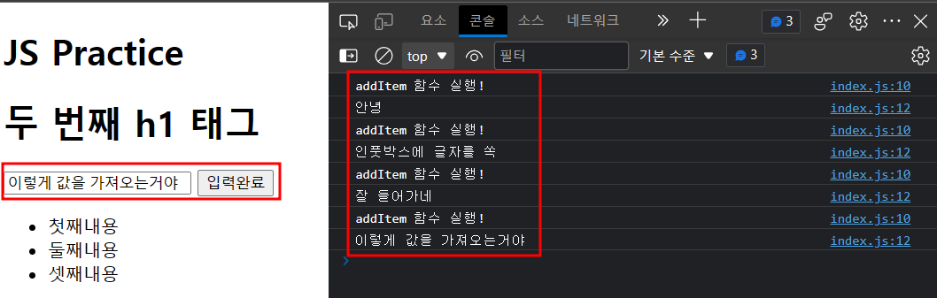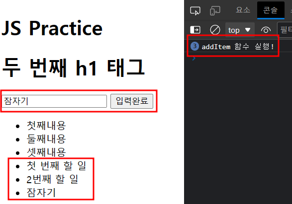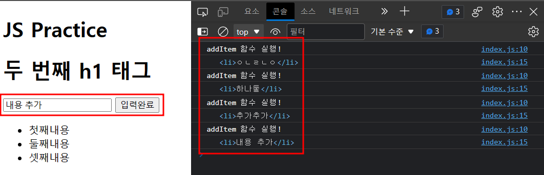 - html에 원래 있던 요소에 인풋박스에서 입력한 값들이 붙는 것을 확인할 수 있다