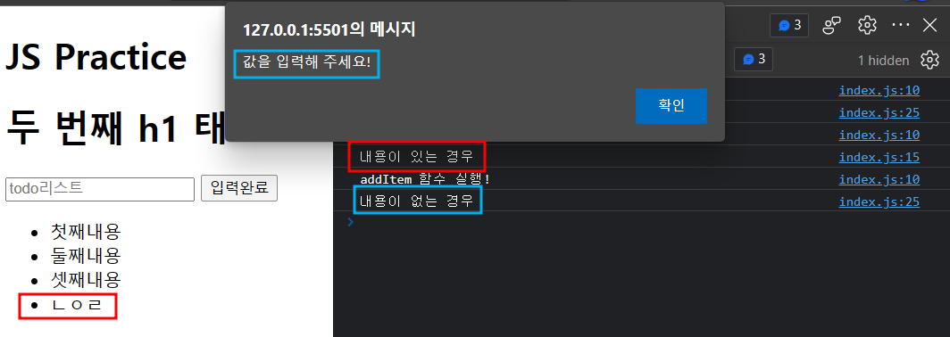- 내용이 있는 경우에는 리스트가 잘 추가되고 있고, 없는 경우에는 경고창이 뜬다!