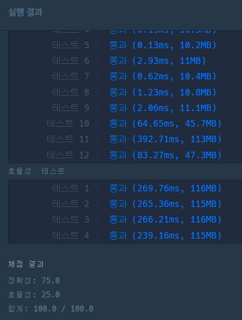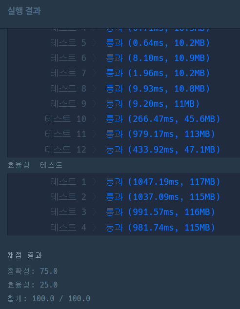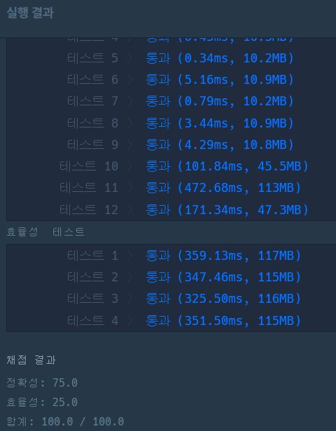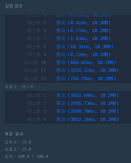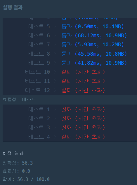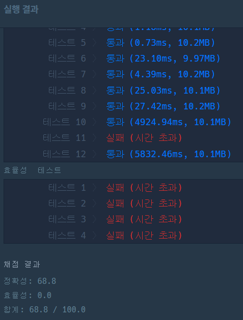 그래서 이런 식으로 바꿔줬는데 프로그래머스에 정답을 채점하려고 하니 테스트 11에서 시간초과가 나온다