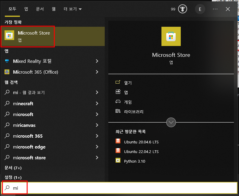 검색창에서 Microsoft Store 입력 후 클릭하기