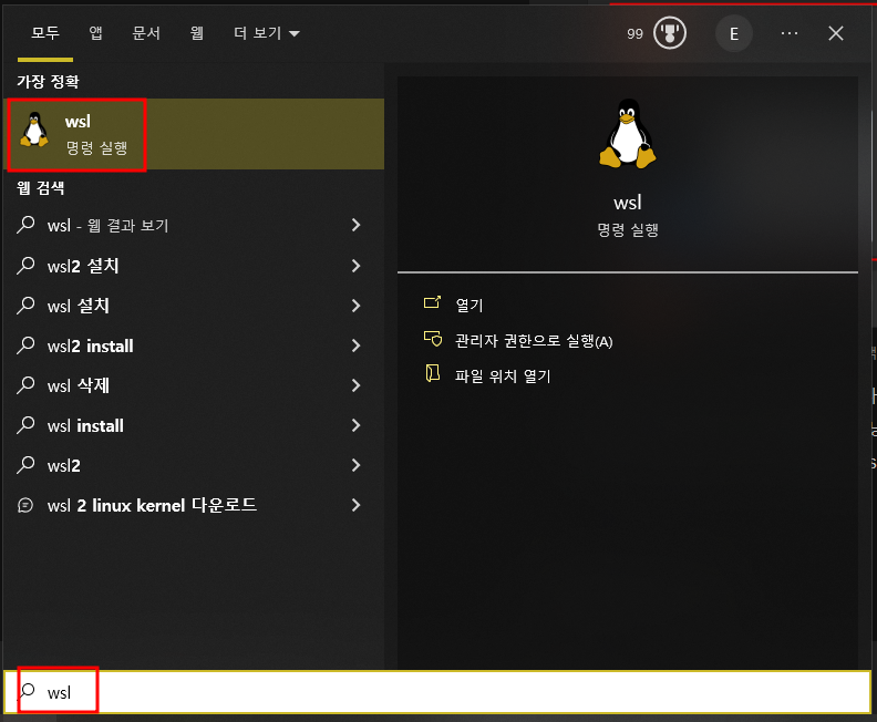 - 그러고 우분투 창을 끄고 검색창에서 wsl 입력 후 클릭한다