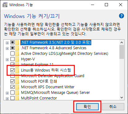 Lunux용 Windows 하위 시스템 체크하고 확인 누르고 재부팅 하기