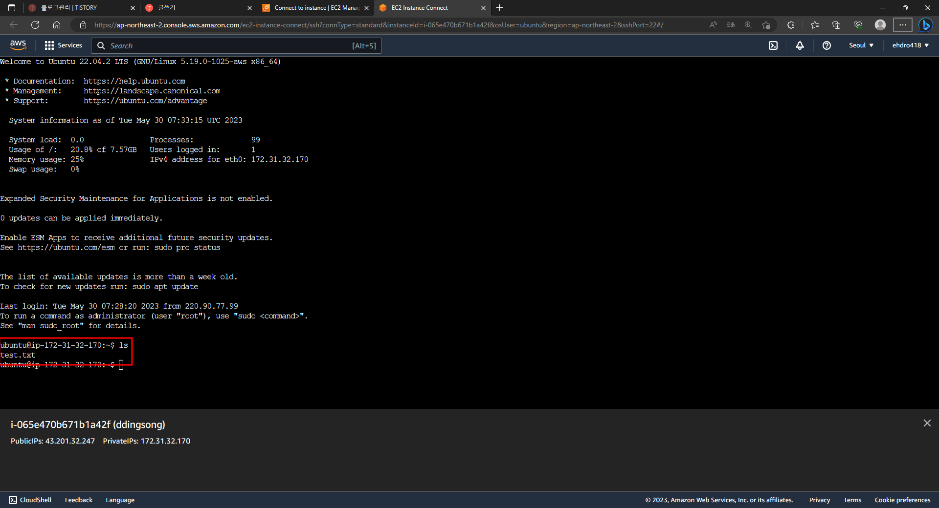 - 즉 인스턴스 커넥트로 들어간 컴퓨터와 wsl로 들어간 컴퓨터가 같은 인스턴스에 들어와 있음을 알 수 있다