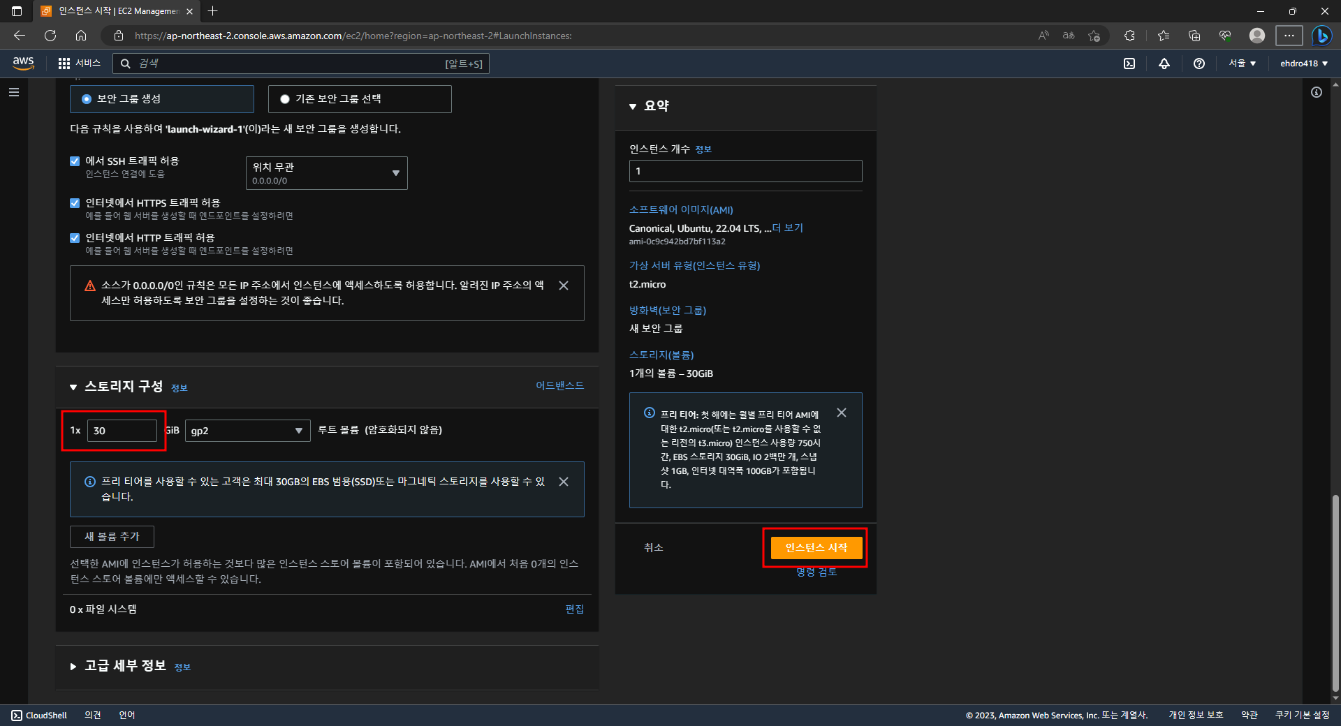 보안 그룹은 미리 만든 거 있으면 그거 선택하고 없으면 SSH, HTTP, HTTPS 다 선택한다