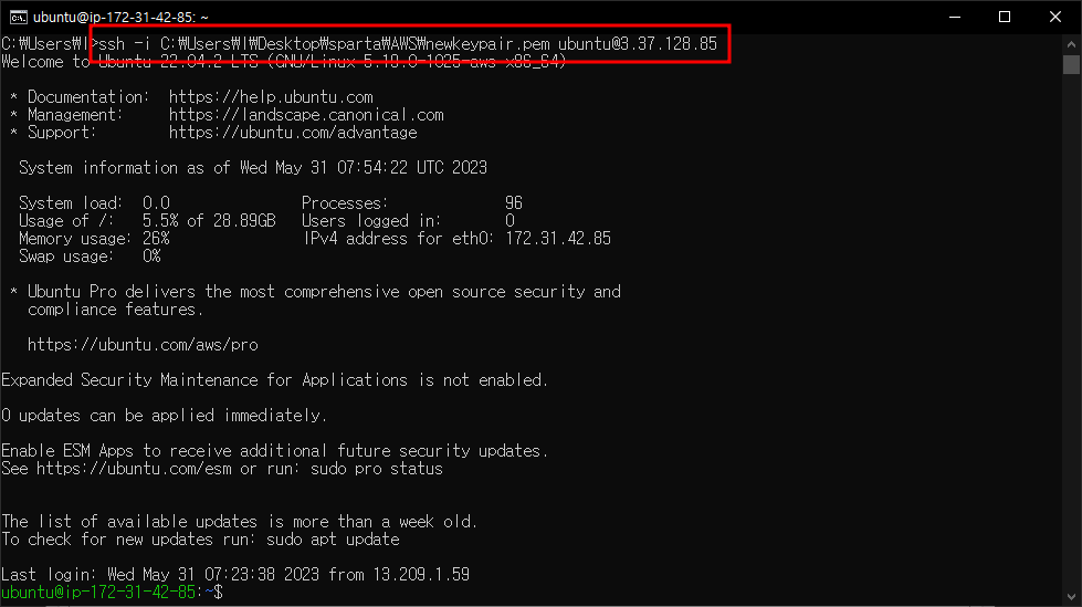 ssh -i C:\Users\l\Desktop\sparta\AWS\newkeypair.pem ubuntu@3.37.128.85