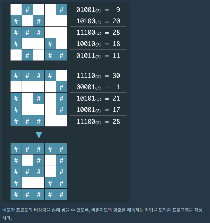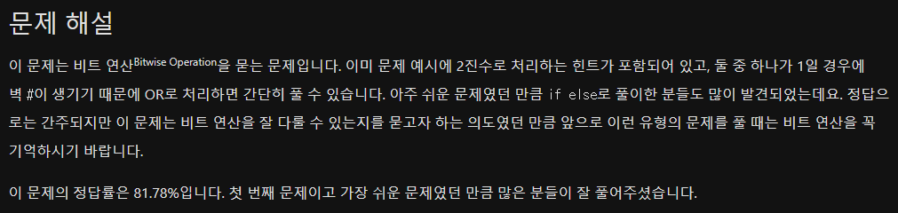 - 내 2번째 풀이에서 rjust()를 해야 했던 이유가 그냥 앞에 공백이면 없어져서 그런 건 줄 알았는데 이 풀이를 보니까 이진수 비트연산 했을 때 2번째 예시의 경우 자리수가 5자리인 값이 있었다 그래서 애초에 맨 앞이 0이 오는 경우가 없었던 거였는데 그걸 몰랐다 ㅋㅋㅋ그냥 맨 앞이 공백이면 그냥 없어지는 줄,,,