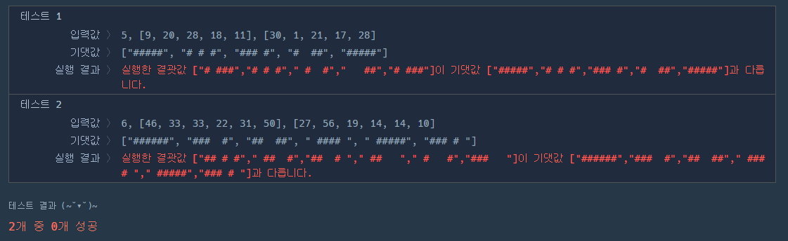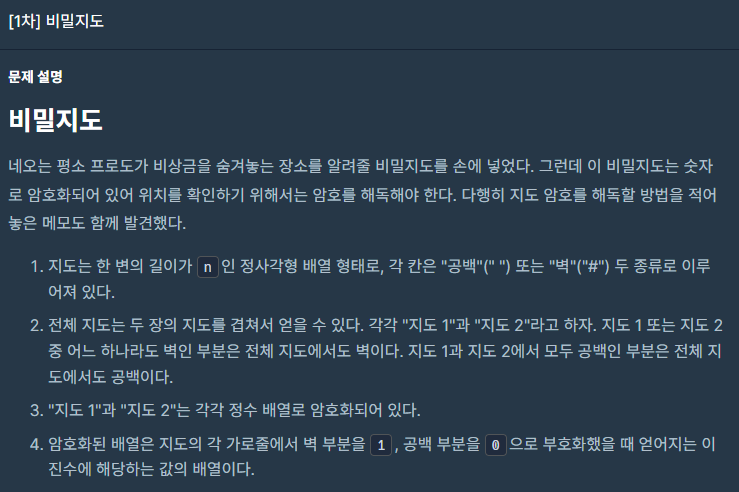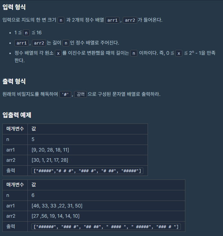 - 그 다음엔 for문을 n만큼 2번 돌려서 arr1과 arr2를 비교해서 둘 다 1이면 #, 둘 중 하나만 1이면 #, 둘 다 0이면 " "을 넣어주면 되지 않을까
