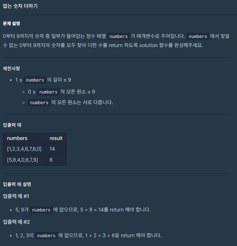 - 일단 0부터 9까지의 리스트를 만들고 numbers를 하나씩 돌리면서 그 숫자가 새로 만든 리스트에 있다면 새로 만든 리스트에서 그 숫자를 뺀 다음 for문이 다 돌면 새로 만든 리스트의 각 요소들을 다 더해서 answer에 넣으면 되겠다!