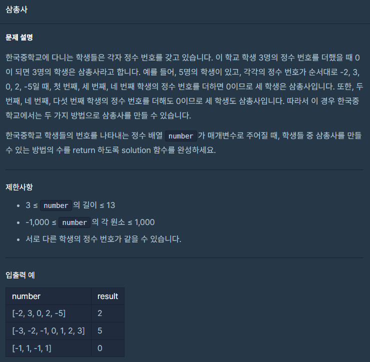 - itertools 라이브러리에서 combinations 함수를 import 해서 number를 3개씩 조합해서 리스트에 담아서 for문을 돌리면서 리스트 각 요소의 합이 0이면 answer를 1씩 더하면 되겠군