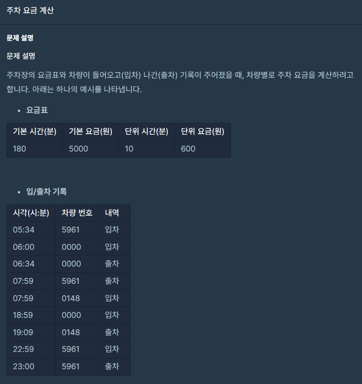 - 우선, records에서 차량번호를 split 해서 중복 제거 후 주차장에 들어온 차량 리스트를 만든다(결과를 차량번호순으로 반환하라고 했으므로 sort() 메서드로 정렬을 해준다!)
