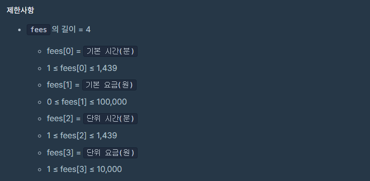 - [초과한 시간이 단위 시간으로 나누어 떨어지지 않으면, 올림합니다.] 이 부분은 어제 배운대로 ceil 함수 없이 올림하는 거 적용해봐야지!