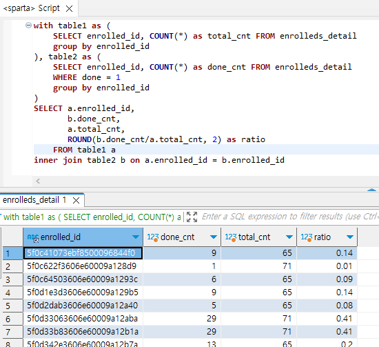 목차 아 넘 어렵다....퀴즈 제대로 못 풀었다........쩝.. 갑자기 왜 이렇게 어려워졌지.... 퀴즈 다시 풀어보면서 복습해야겠다. Q1. 평균 이상의 포인트를 가지고 있으면 '잘하고 있어요!' / 낮으면 '열심히 합시다!' 표시하기 Q2. 이메일 도메인별 유저의 수 세어보기 Q3. '화이팅이 포함된 오늘의 다짐만 출력해보기 Q4. 수강등록정보별 들은 강의의 수와 전체 강의 수 출력해보기 Q4에 with절 사용하여 풀어보기 Q5. 수강등록정보별 들은 강의의 수와 전체 강의 수, 진도율 출력해보기 Q4 더 간단하게 풀기 공유하기 게시글 관리 개발 벌크업 목차 목차 닫기
