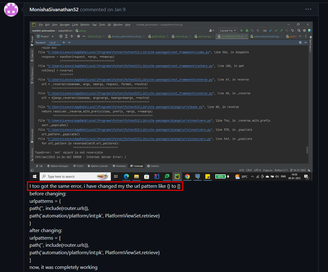 - python - TypeError at /admin/ 'set' object is not reversible and argument( ) to reverse must be a sequence - Stack Overflow