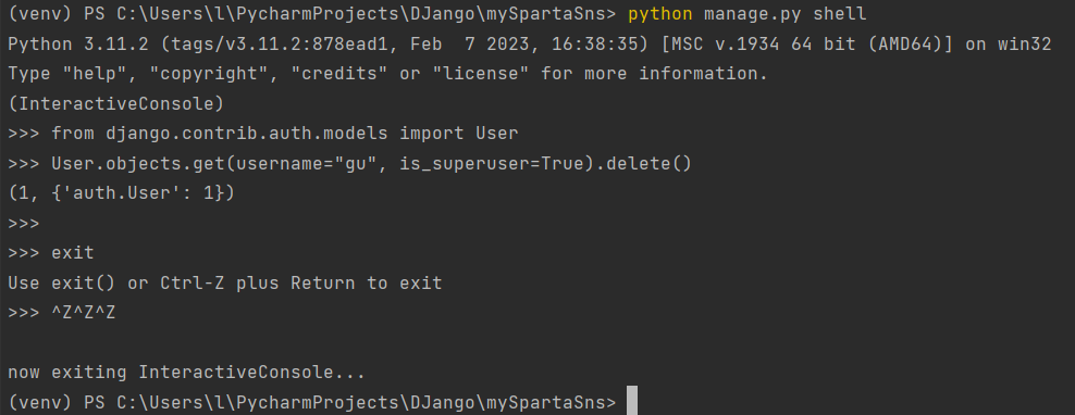 - User.objects.get(username="<유저이름>", is_superuser=True).delete()
