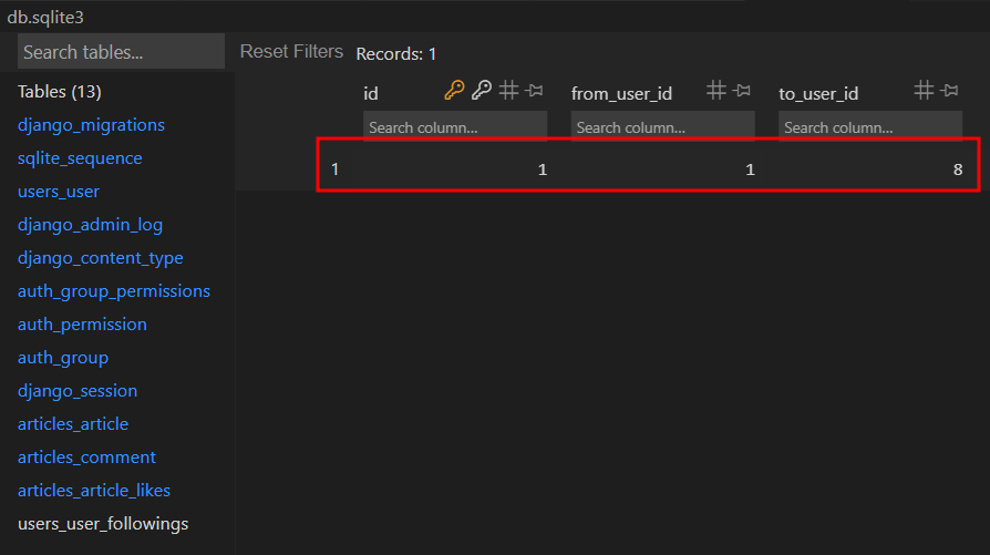 - 데이터베이스에 가보면 팔로잉 테이블에 데이터가 추가된 것을 볼 수 있다