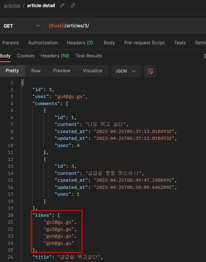 - 게시글 상세보기에서 참조하고 있는 건 ArticleSerializer니까 그 부분을 수정해준다