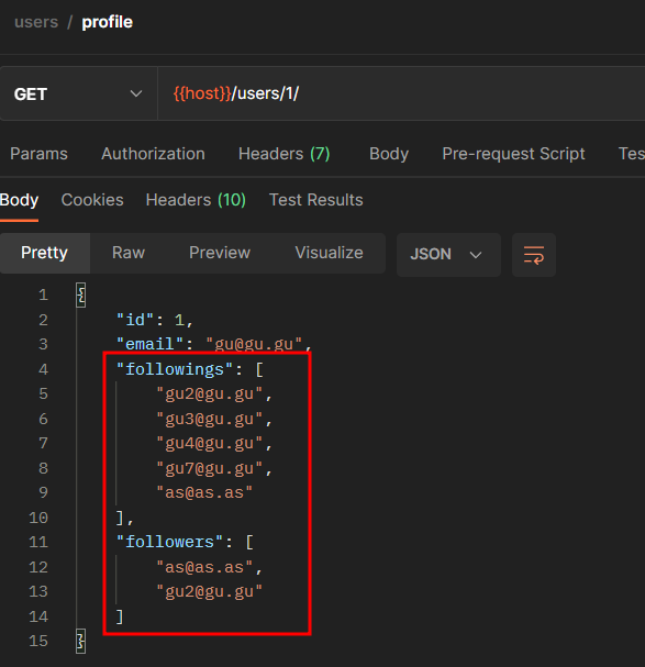 - 몇몇 유저의 팔로우를 추가하고 다시 포스트맨에서 실행해보면 팔로잉과 팔로워에 추가된 것을 확인할 수 있다