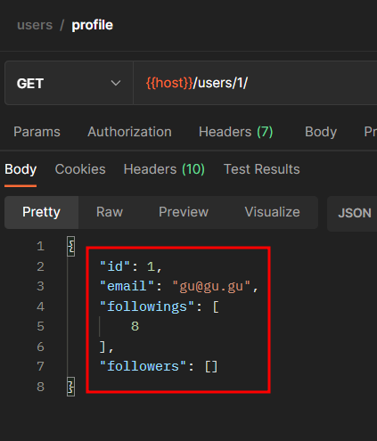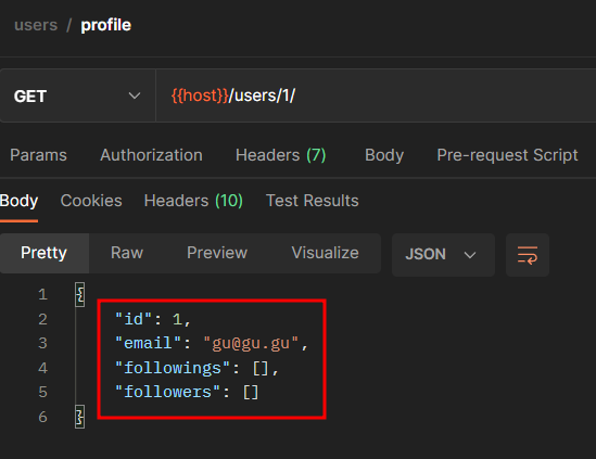 - 이렇게 수정하고 다시 포스트맨에서 실행하면 팔로잉, 팔로워 모두 아이디 번호로 뜨는 것을 확인할 수 있다