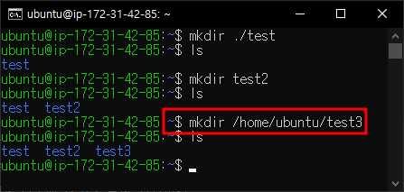 mkdir /home/ubuntu/test3 # /home/ubuntu 경로에 test3 폴더 생성하기