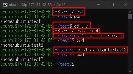 cd /home/ubuntu/test2 # test3 폴더에서 절대 경로를 이용해서 test2로 이동하기